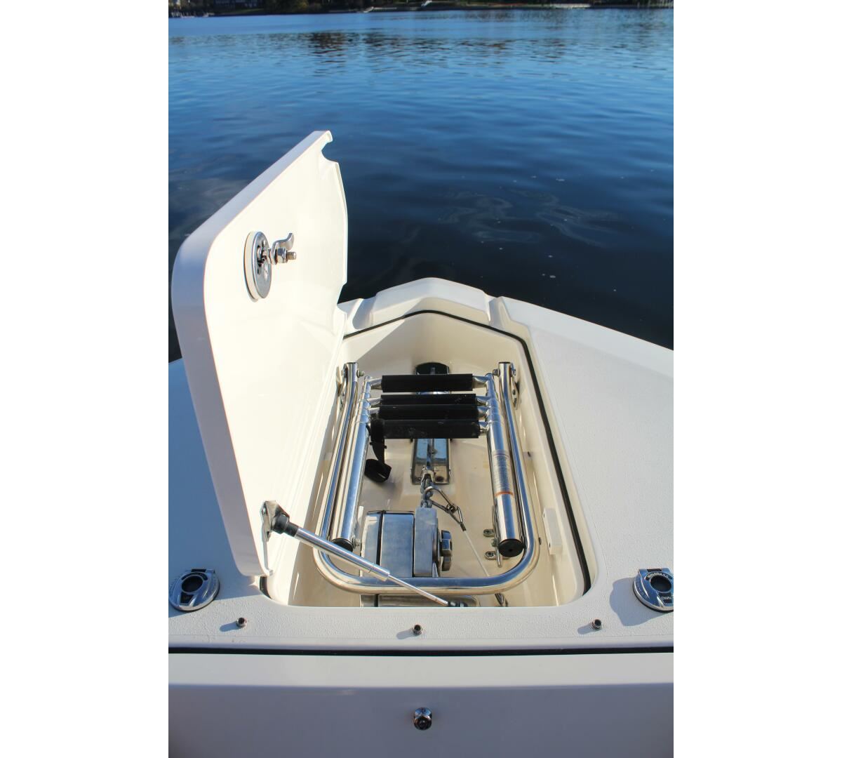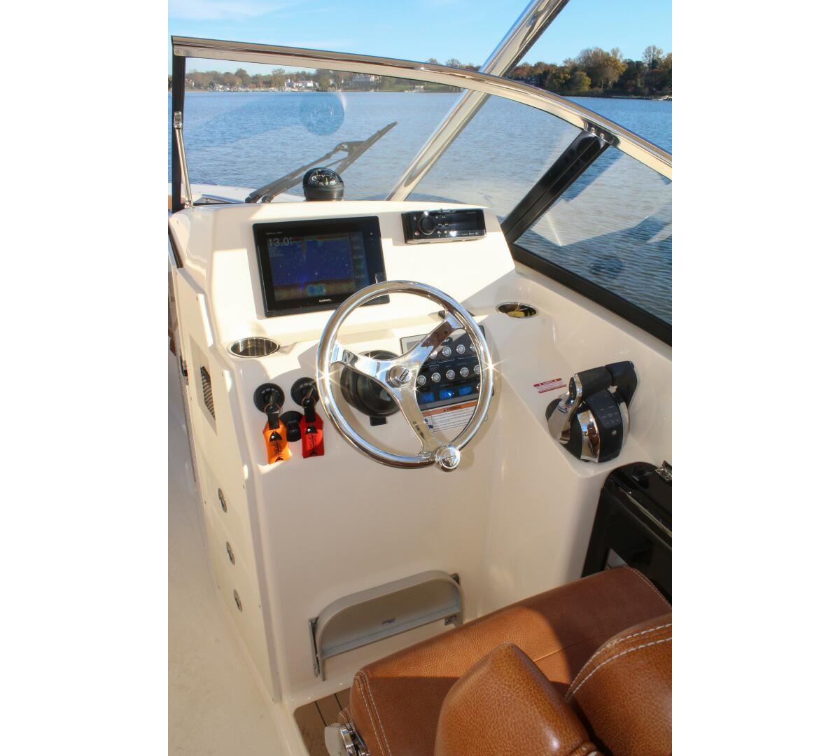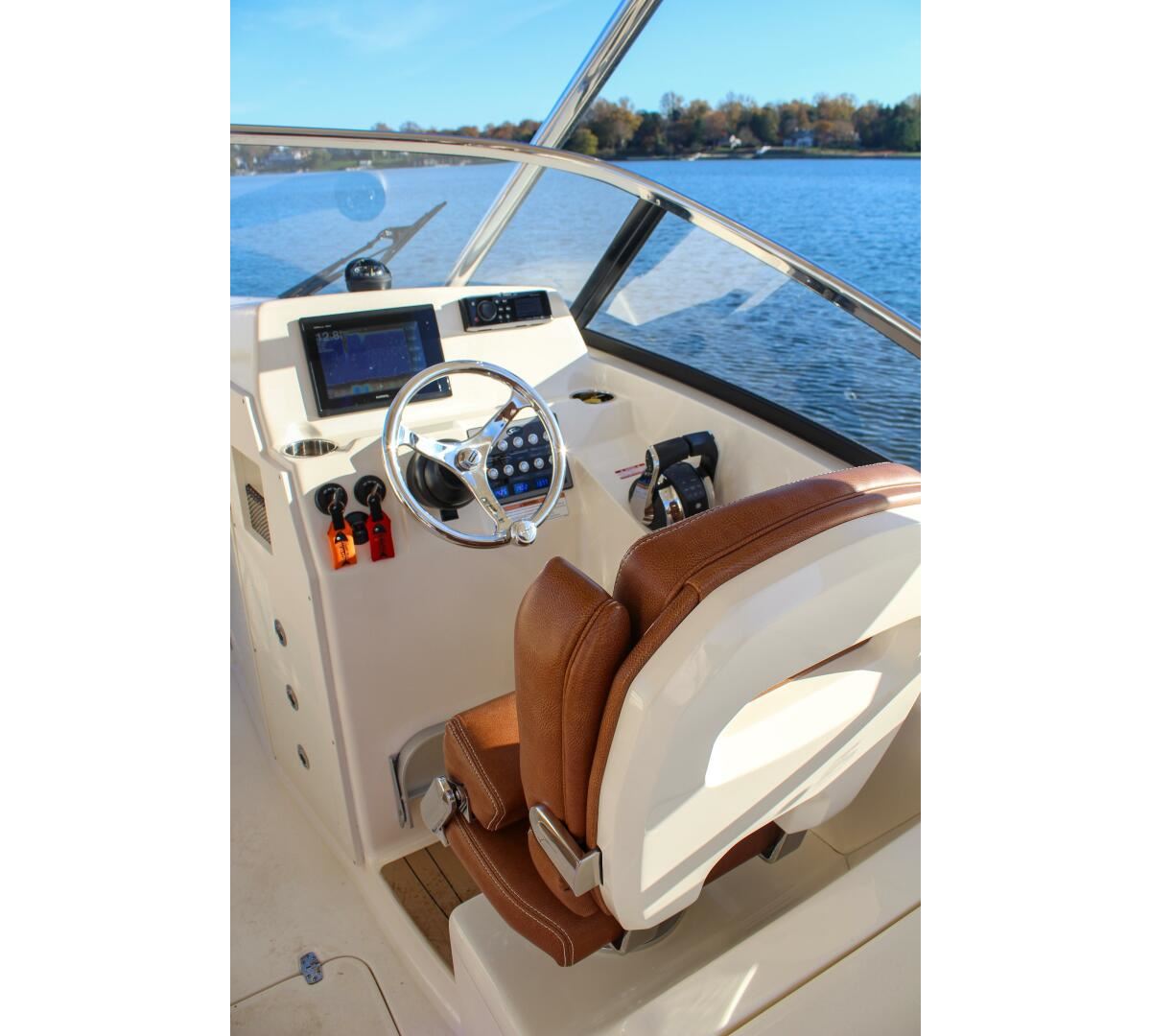 The Scout 275 Dorado is the ultimate family boat, offering ample space, comfort, and family-friendly features for memorable water adventures. With innovative design and advanced technology, this 27'5" vessel is the largest in its lineup, equipped with a 400-horsepower capacity for speed and acceleration. Its spacious layout includes a 9-gallon waste tank, a 14-gallon freshwater tank, and a 25-gallon bait well. The built-in fiberglass hardtop provides shade on sunny days, ideal for families with young children. Enjoy luxurious cruising, watersports with the telescopic swim ladder, and excellent fishing amenities such as live-well, rod holders, and lure drawers.