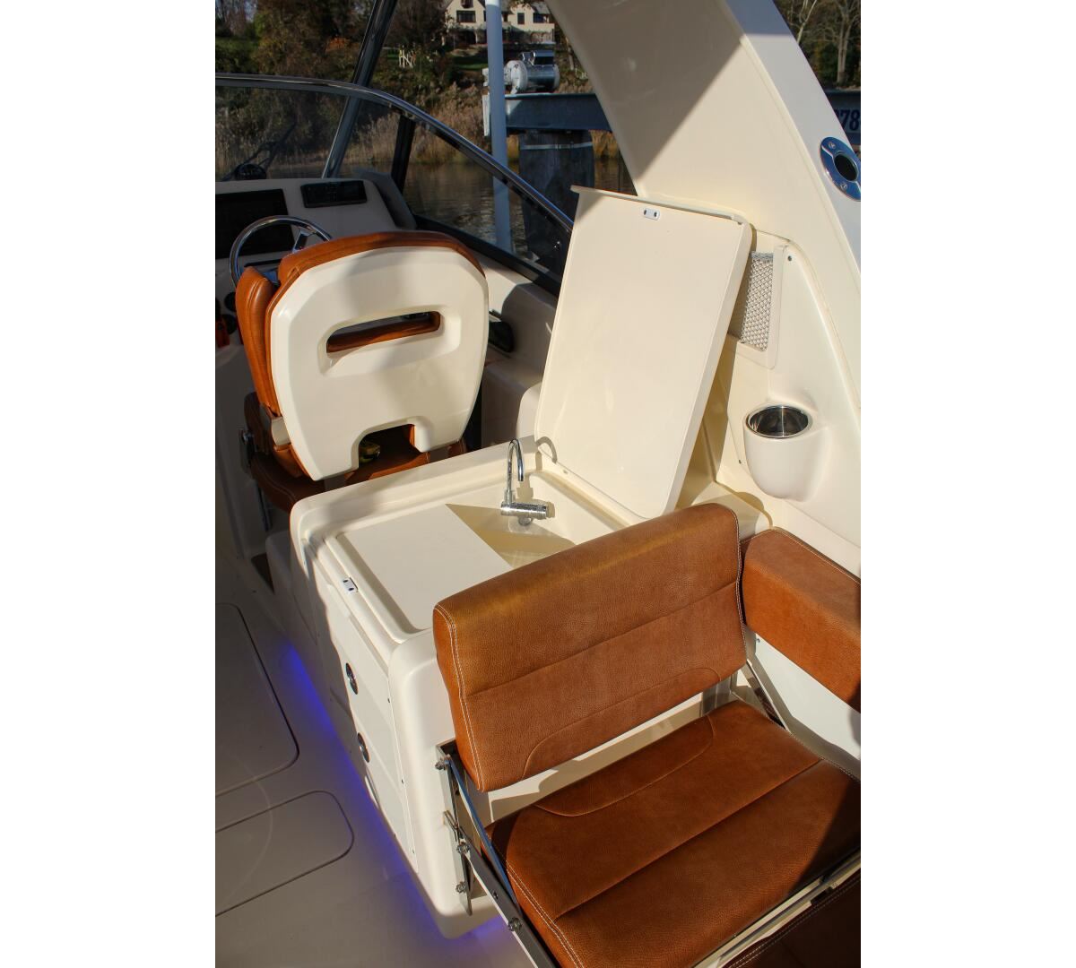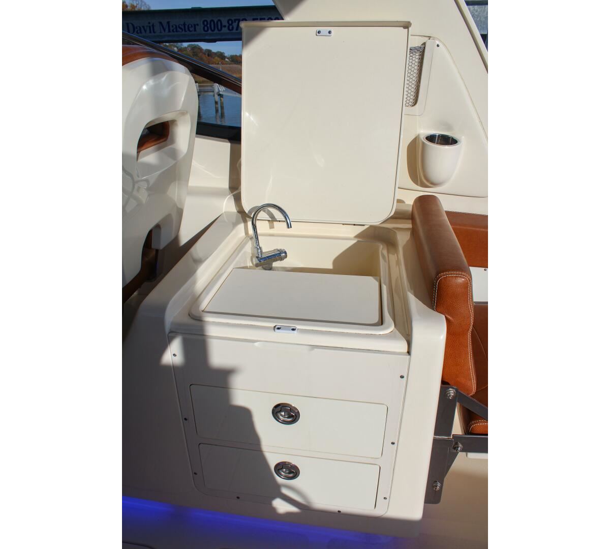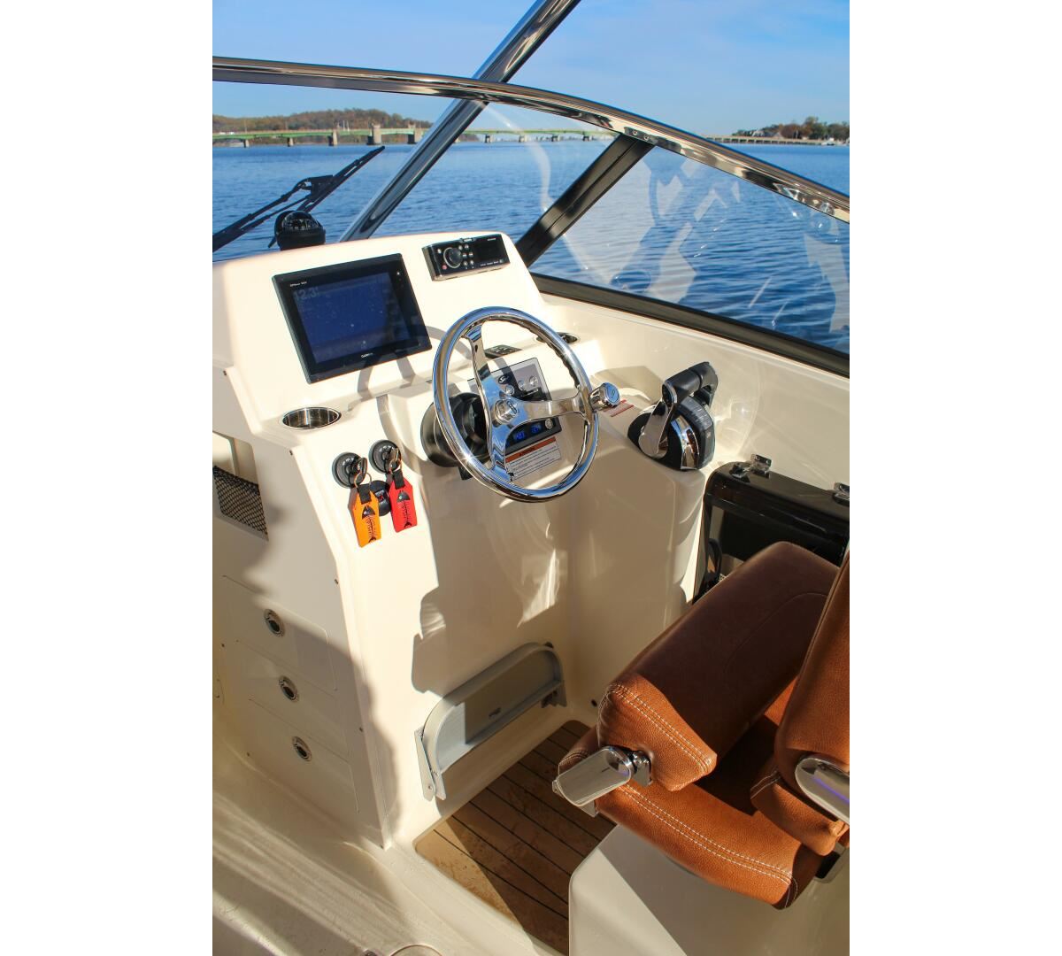 The Scout 275 Dorado is the ultimate family boat, offering ample space, comfort, and family-friendly features for memorable water adventures. With innovative design and advanced technology, this 27'5" vessel is the largest in its lineup, equipped with a 400-horsepower capacity for speed and acceleration. Its spacious layout includes a 9-gallon waste tank, a 14-gallon freshwater tank, and a 25-gallon bait well. The built-in fiberglass hardtop provides shade on sunny days, ideal for families with young children. Enjoy luxurious cruising, watersports with the telescopic swim ladder, and excellent fishing amenities such as live-well, rod holders, and lure drawers.
