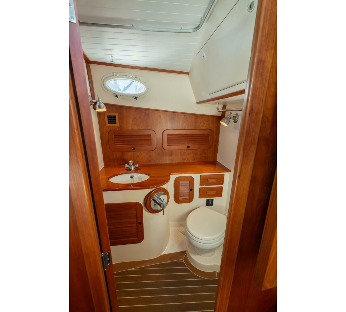 Stunning varnished teak transom and teak clad swim platrform
